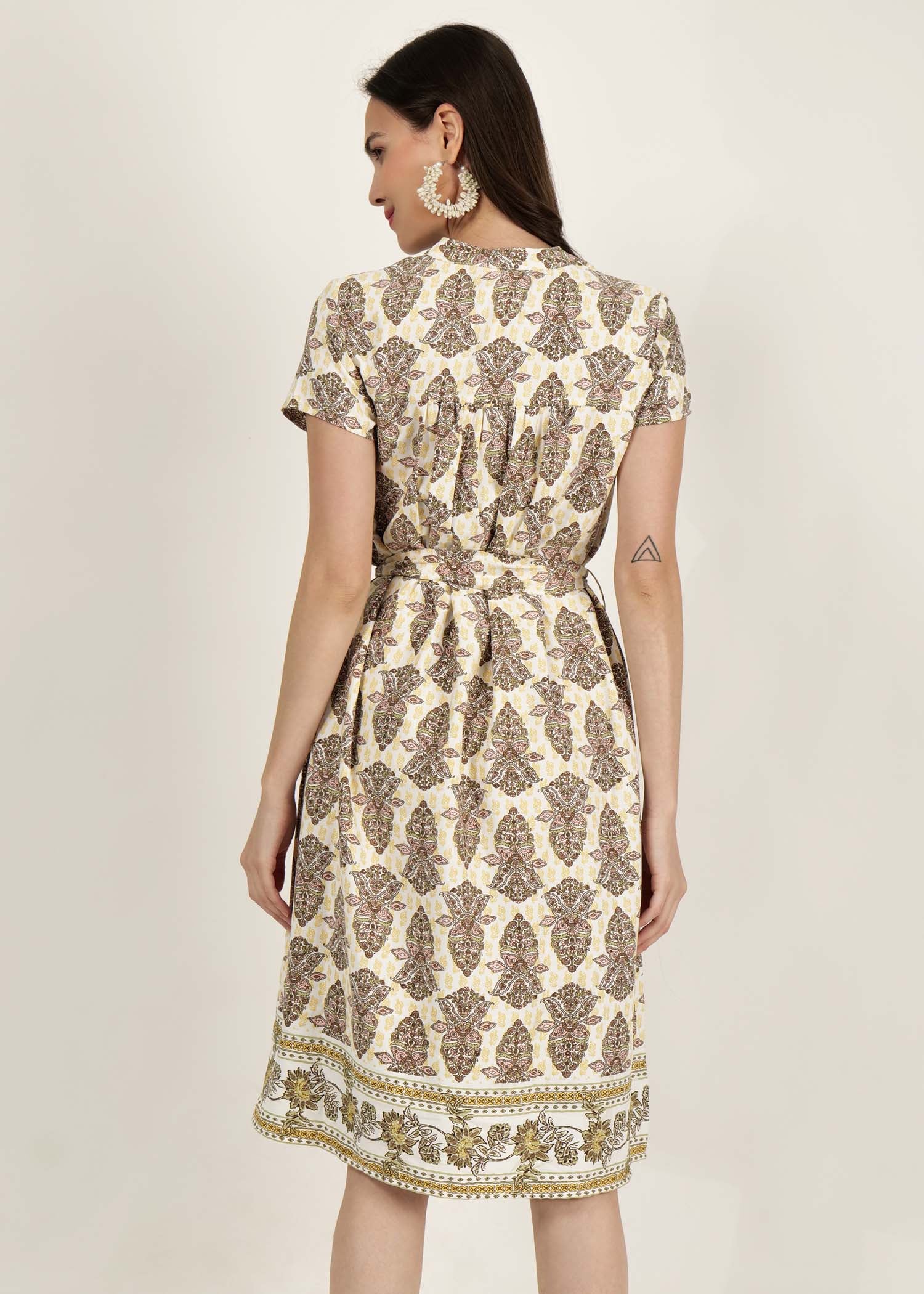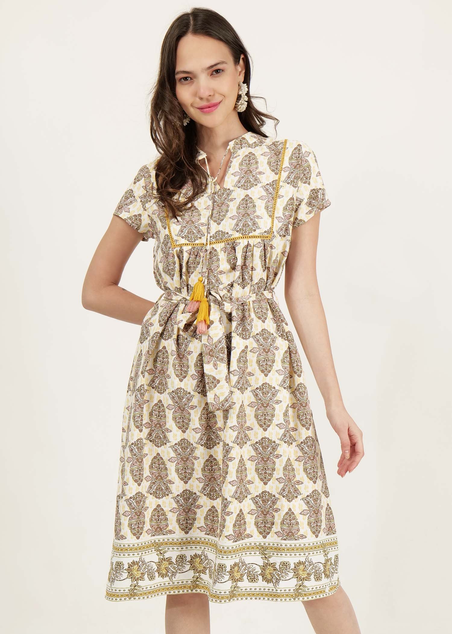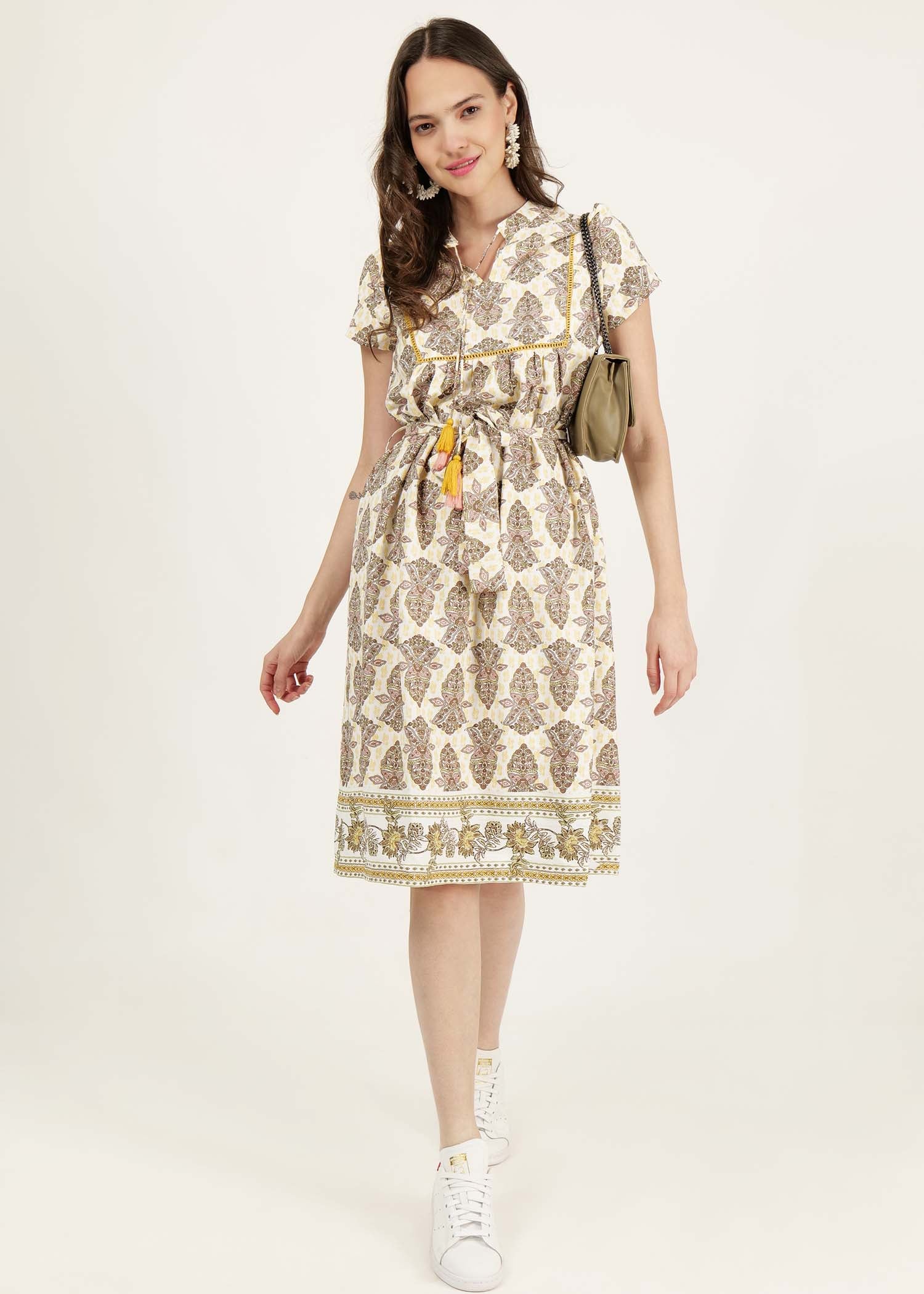 BORDER PRINT DRESS WITH TASSELS AT NECK