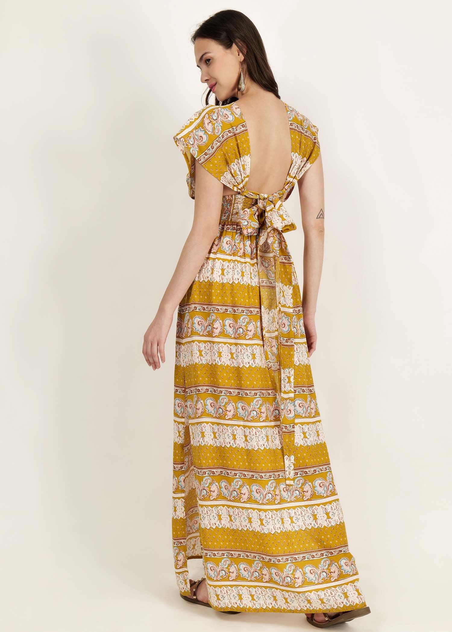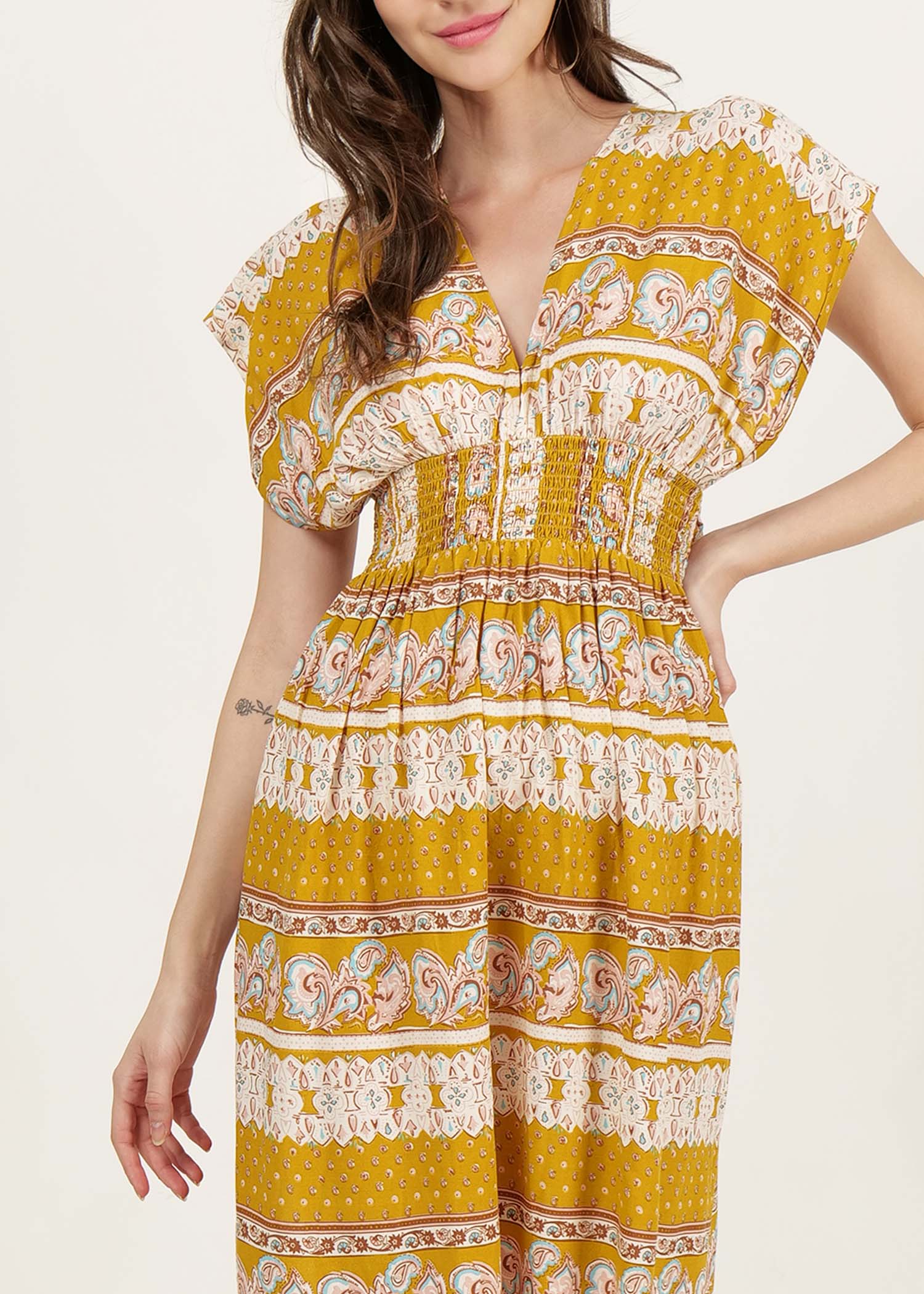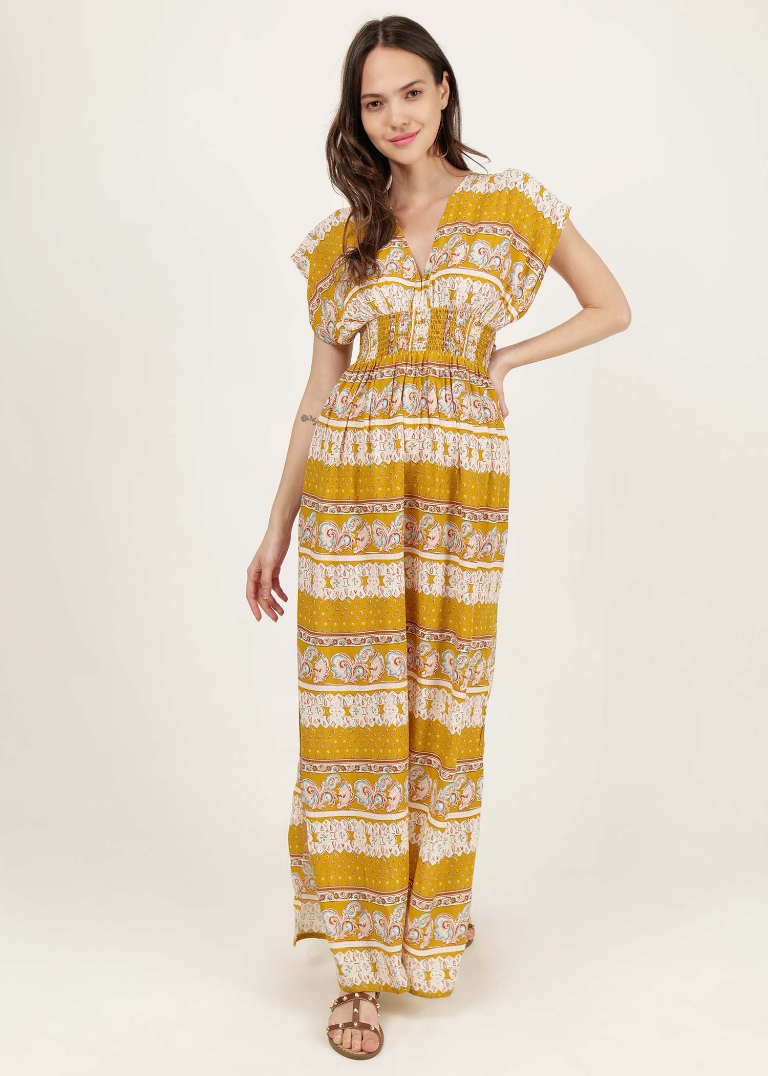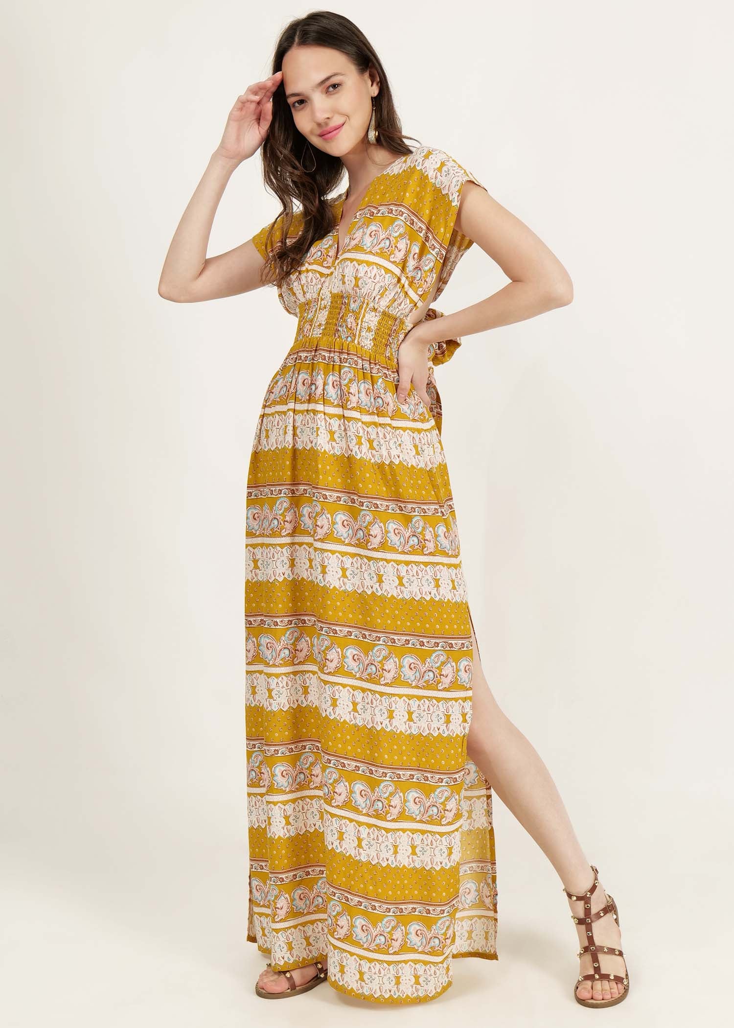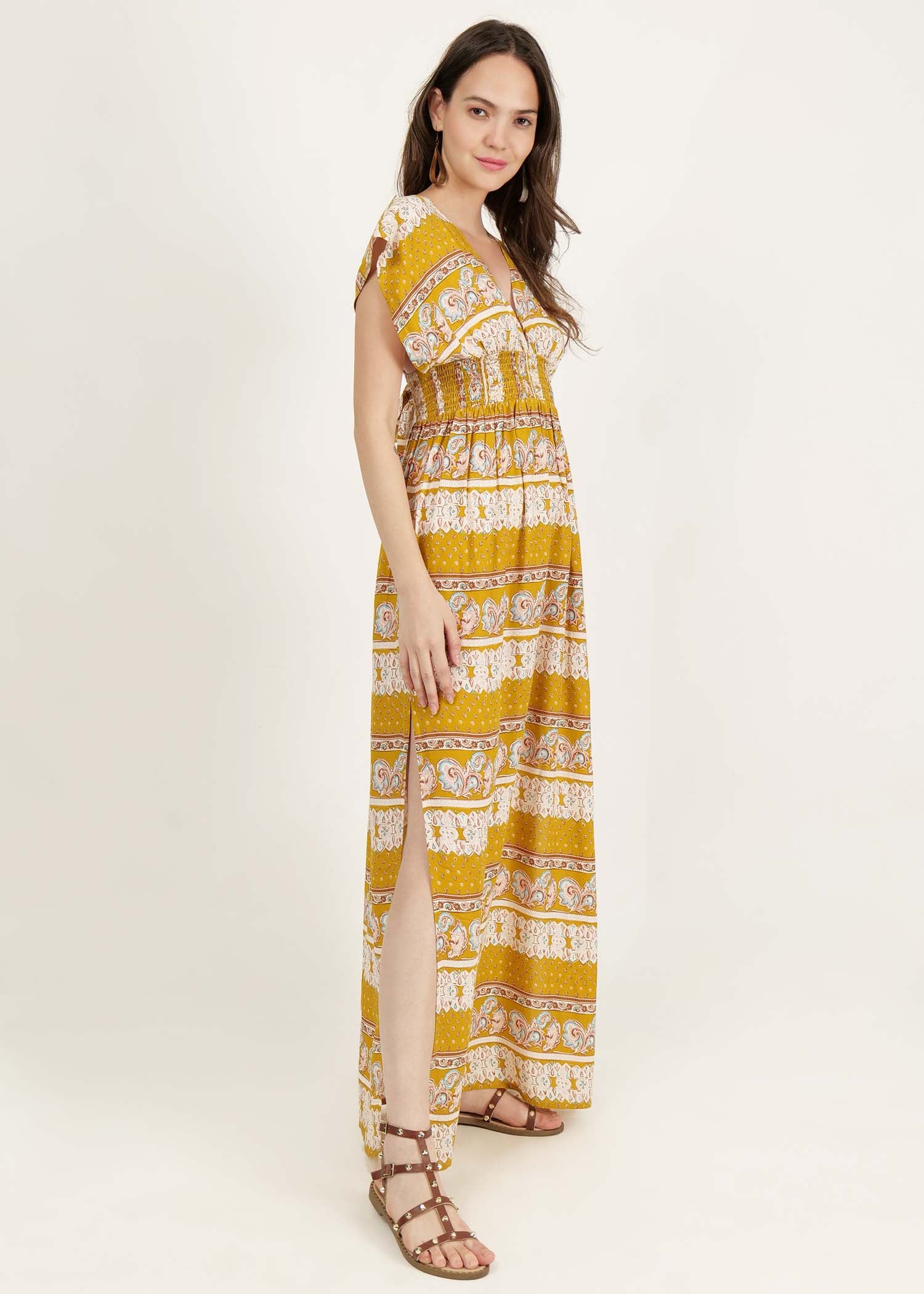 long dress with slit at side and smocked waist