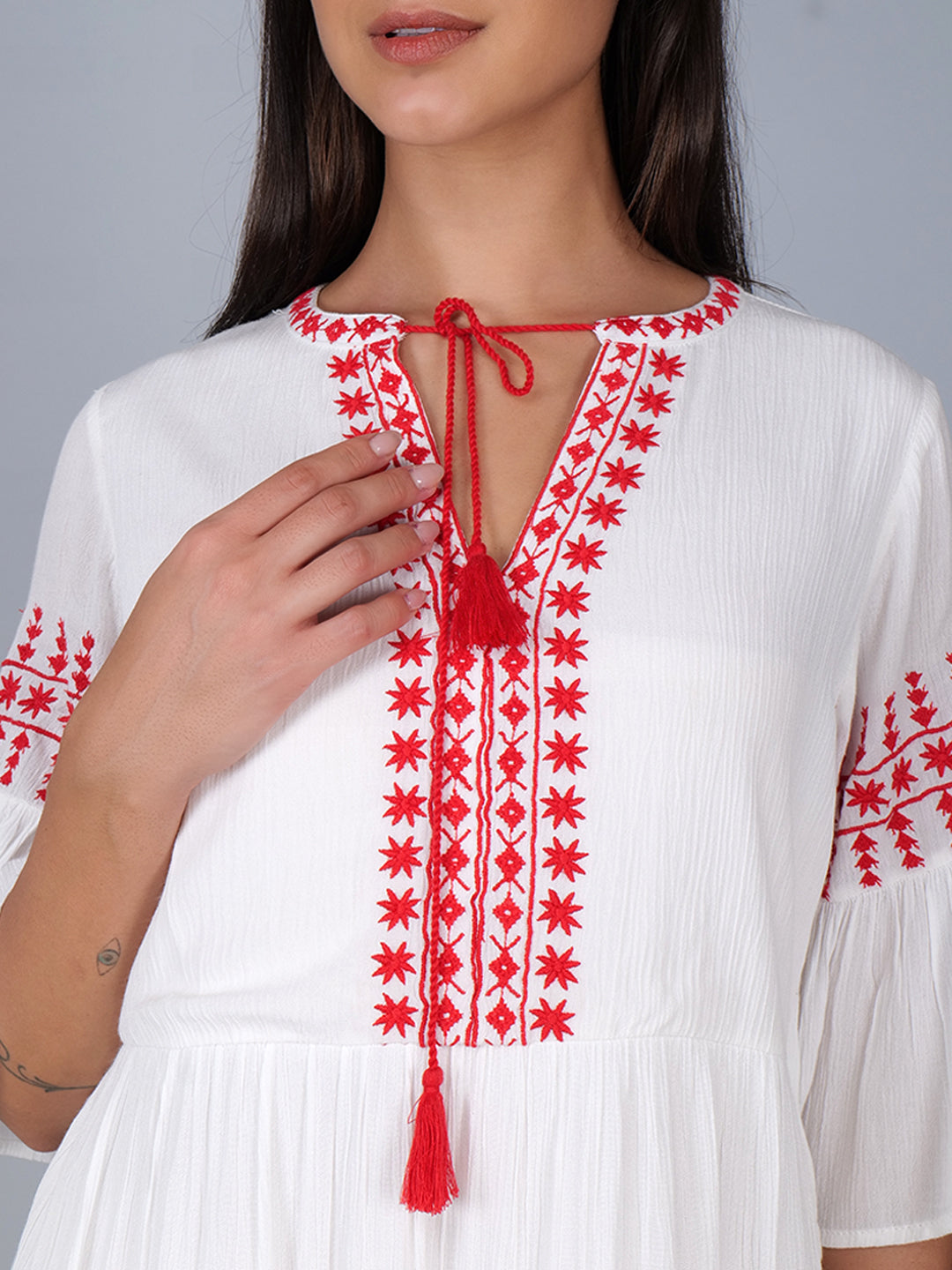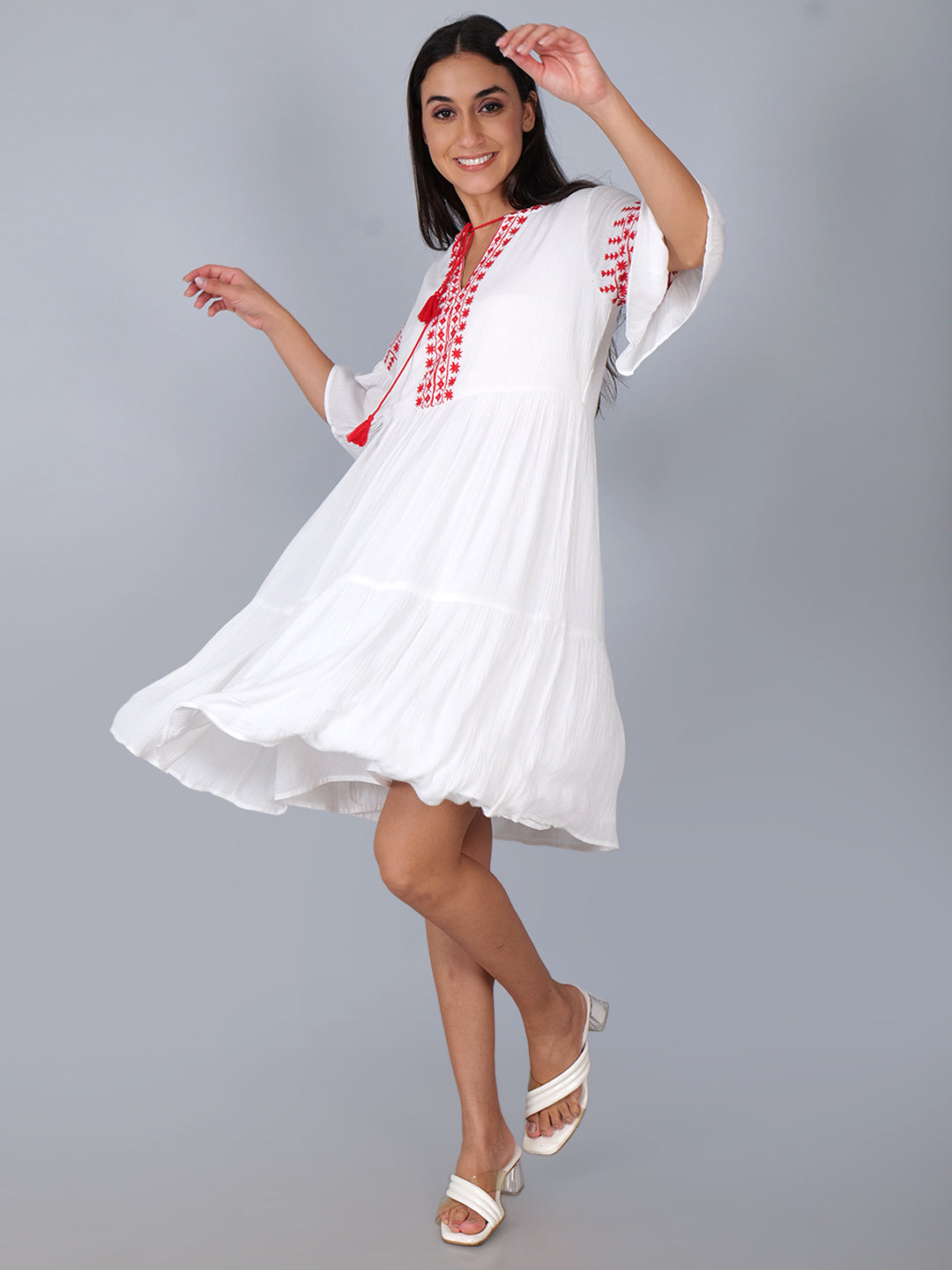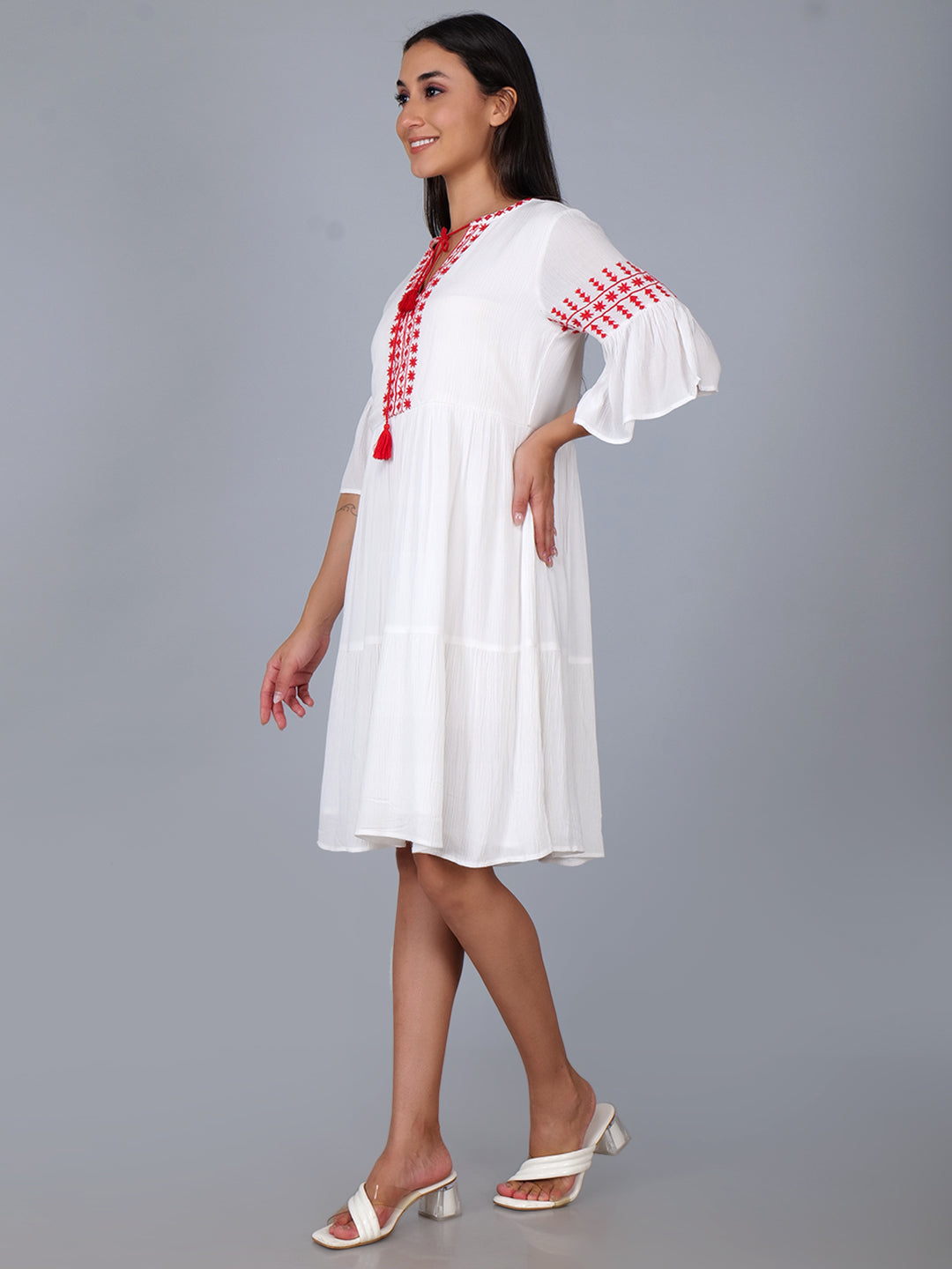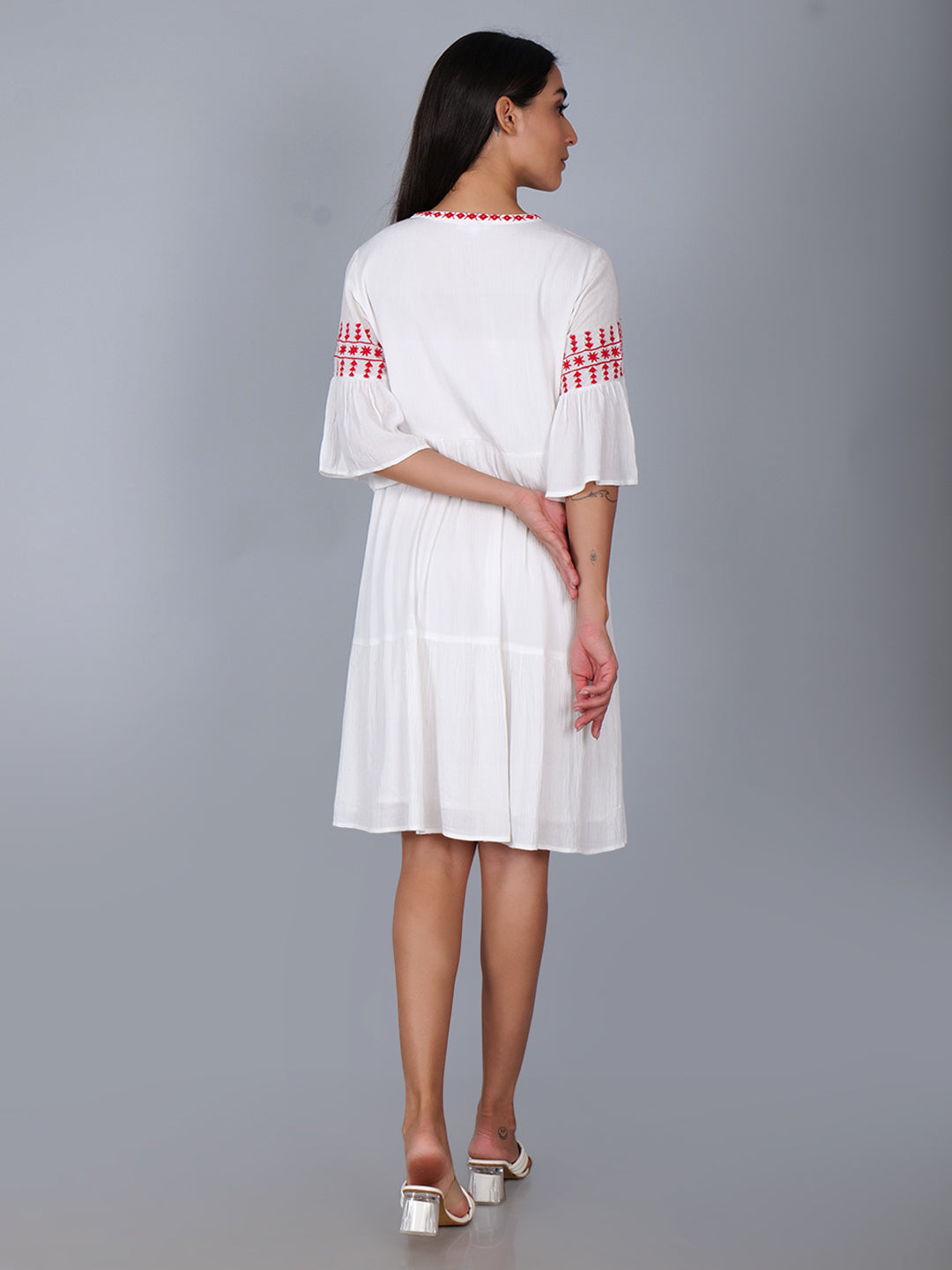 Tiered dress with embroidery details in white . Fully lined