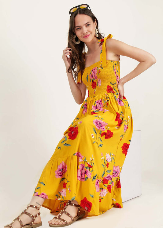 Floral Printed Cap Sleeves Fit & Flare Cotton Maxi Dress